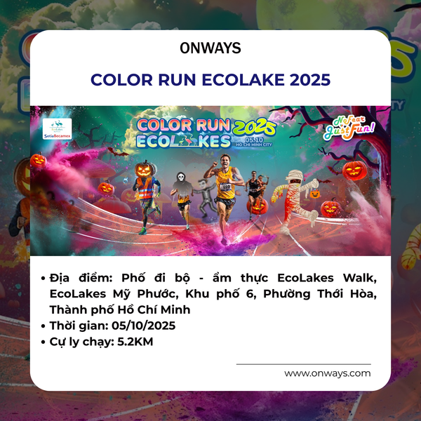 Color Run EcoLakes 2025” đã trở lại đầy màu sắc và năng lượng với nhiều điểm mới hấp dẫn chờ đón tất cả vận động viên. Hãy cùng hoá trang Halloween thật sáng tạo, bùng nổ trên đường chạy sắc màu 5km, vượt chướng ngại vật thú vị, hoà mình vào những điệu nhảy flashmob sôi động và hàng loạt hoạt động giải trí cuốn hút trên sân khấu.