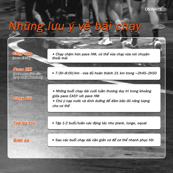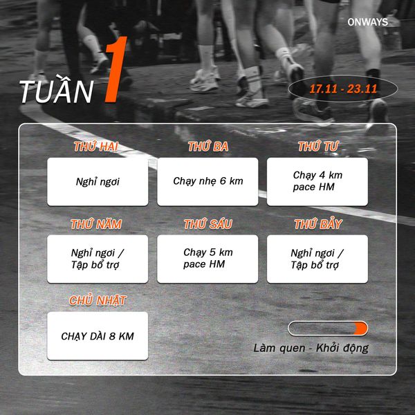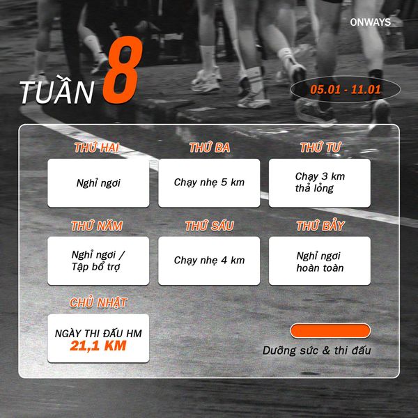 21km không chỉ là khoảng cách mà còn là thử thách bản thân, rèn ý chí và niềm tự tin. Lịch tập 8 tuần chuẩn từ ONWAYS, được thiết kế để dẫn bạn từng bước đến vạch đích cự ly 21km tại HCMC Marathon 2026.