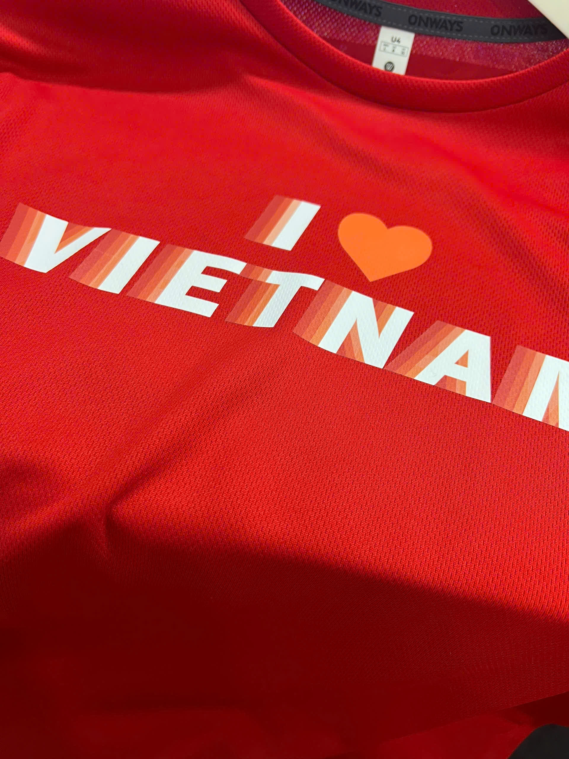 Chiếc áo mang đậm tinh thần yêu nước với slogan "I LOVE VIETNAM" nổi bật trước ngực và hình ảnh Quốc kỳ Việt Nam được in nổi phía sau – như một tuyên ngôn tự hào về nguồn cội.
