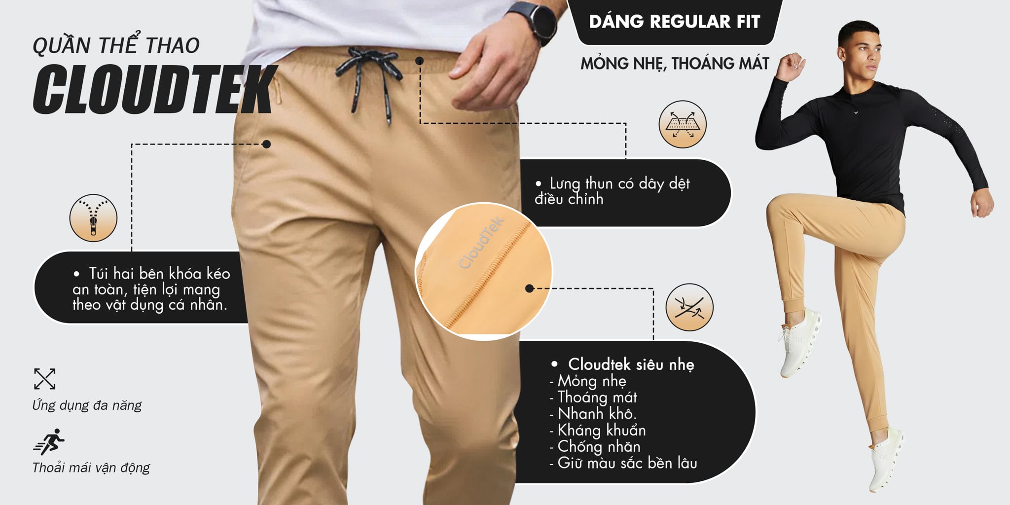 Mình thích phần waistband của quần jogger – ôm vừa đủ, không bị tụt khi tập deadlift. Chất vải co giãn tốt, squat full depth thoải mái.