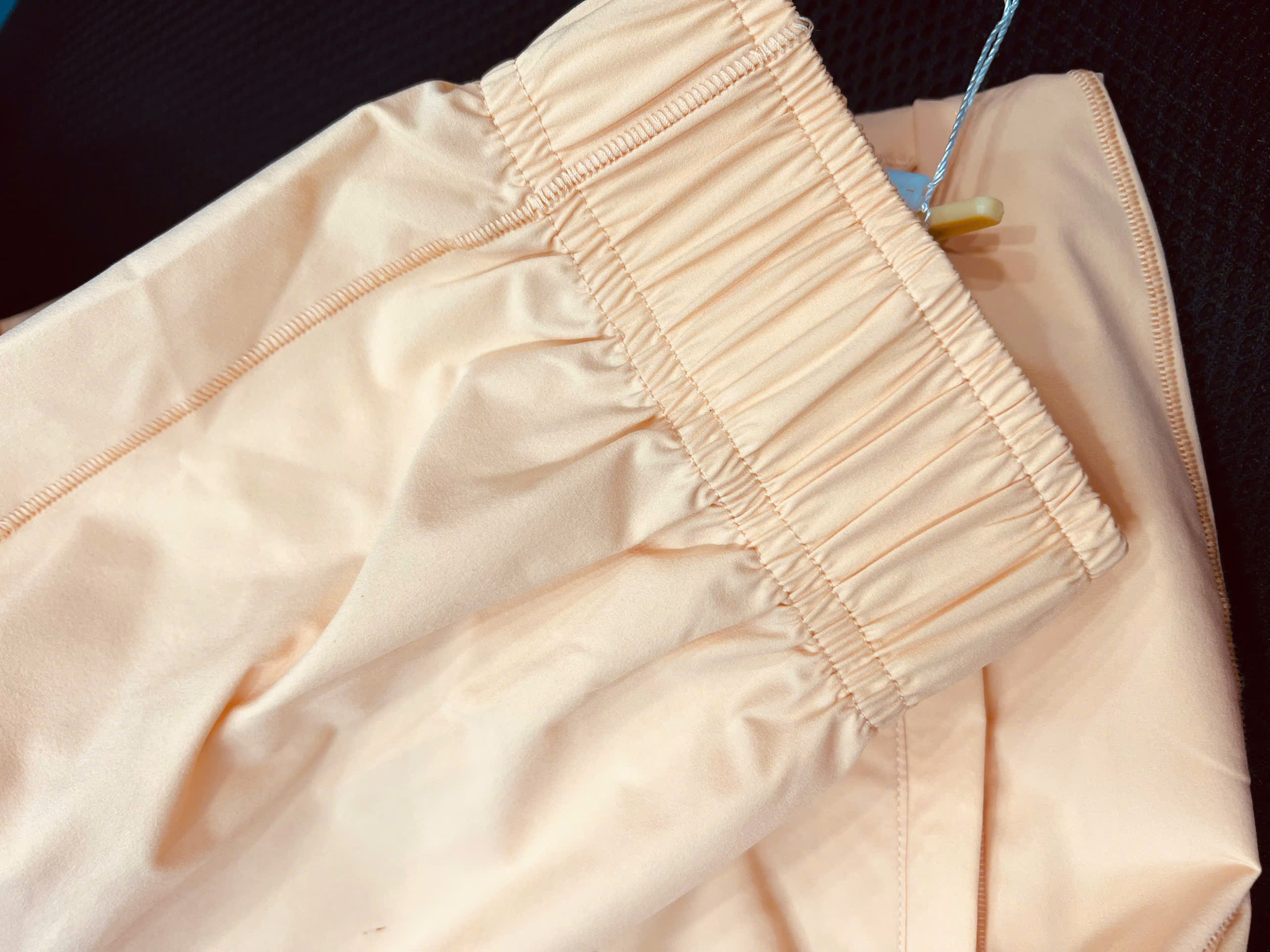 Chất liệu trượt nước rất hay, mình bị dính nước nhẹ trên quần chùi nhẹ là hết. Lại còn co giãn ngồi lên xuống không hề bị kích ở mông