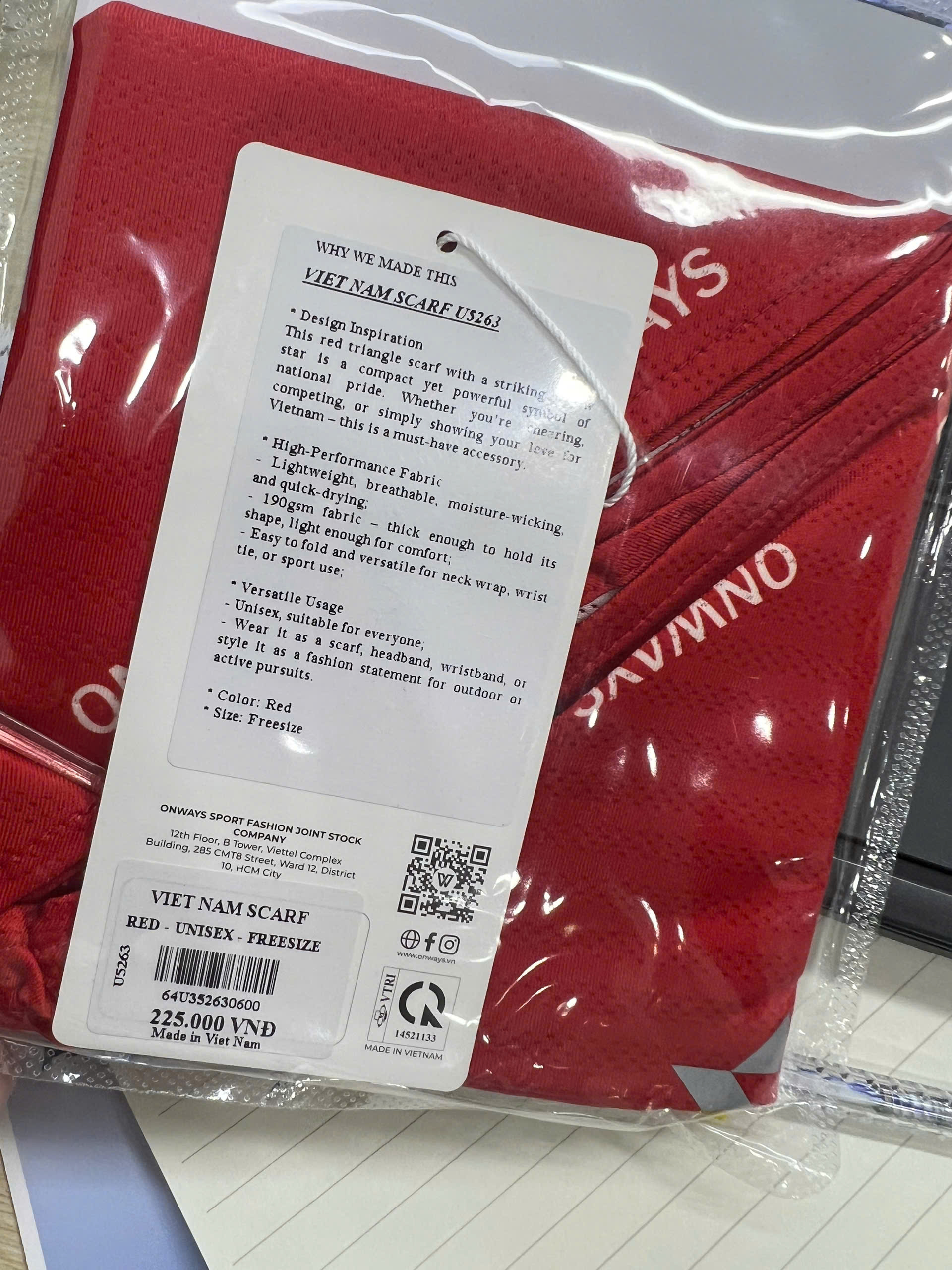 Khăn Việt Nam Scarf U5263 màu đỏ nổi bật với họa tiết ngôi sao vàng, chất liệu nhẹ, co giãn và thoáng khí, giúp thấm hút mồ hôi tốt khi vận động. Thiết kế freesize, unisex, phù hợp cho nhiều hoạt động thể thao và thể hiện tinh thần yêu nước. Giá hợp lý, dễ phối đồ, gọn nhẹ và tiện dụng.